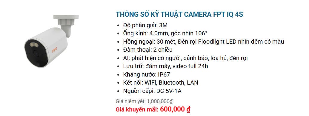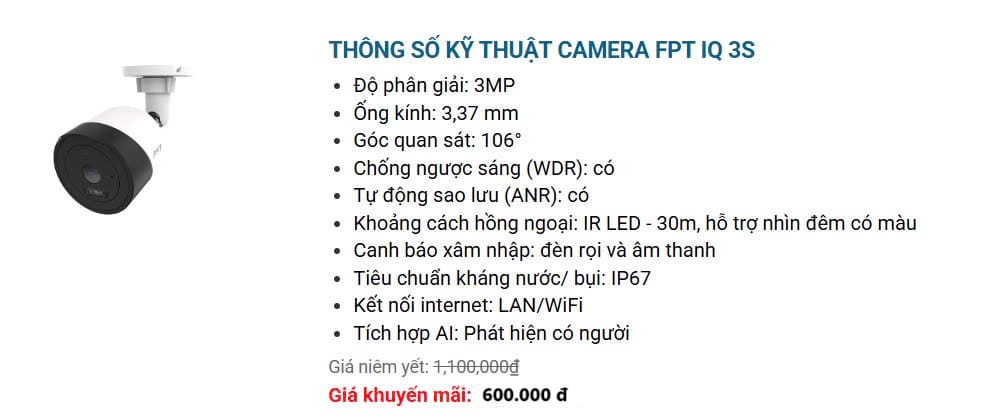 4. FPT Camera IQ3S là dòng thiết bị FPT Camera chuyên dụng để lắp đặt ngoài trời vừa ra mắt năm 2024. Với độ phân giải 3MP, tầm nhìn xa hồng ngoại đến 30 met, có đèn Led rọi buổi tối kèm còi hú khi phát hiện chuyển động.